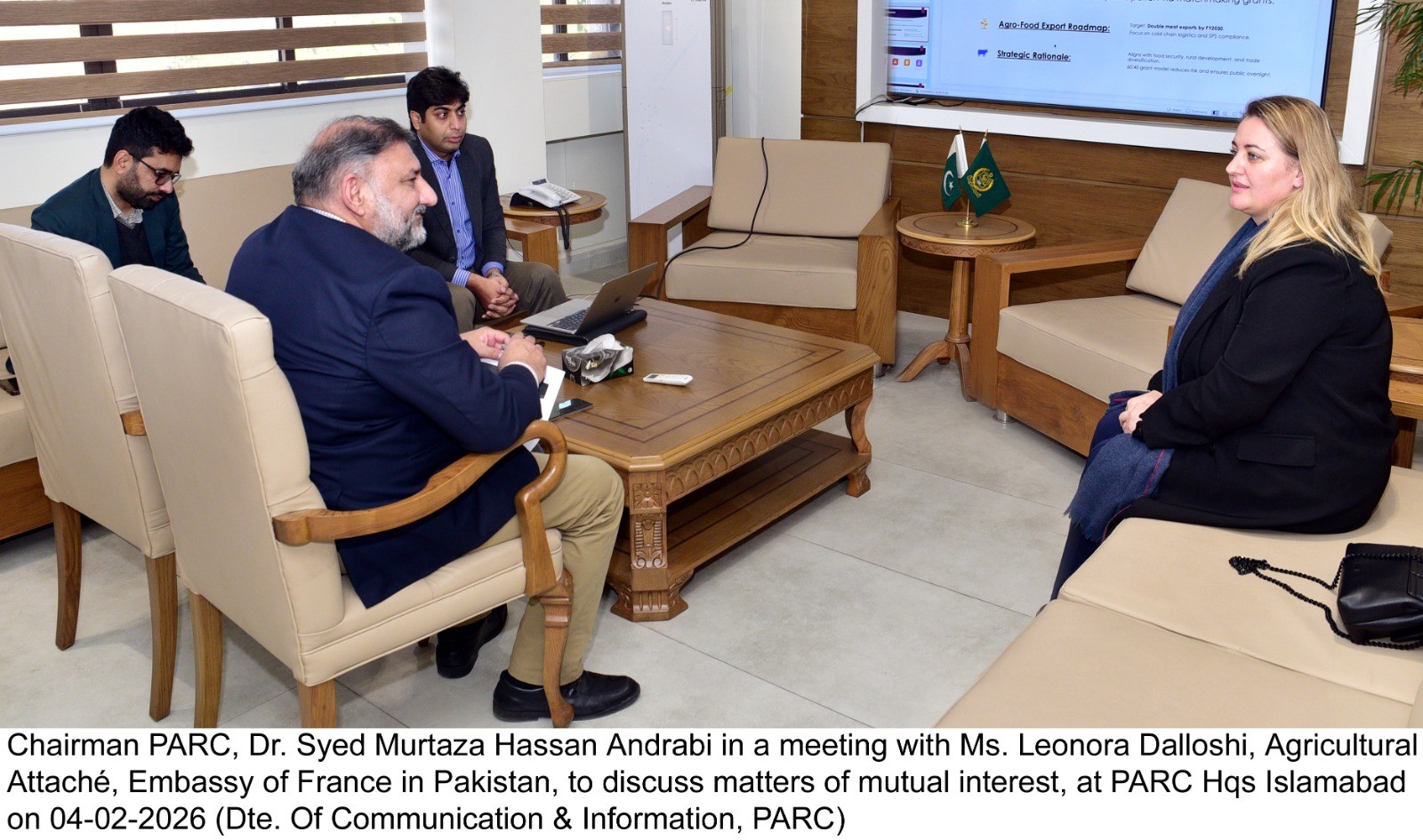 Chairman PARC, Dr. Syed Murtaza Hassan Andrabi in a meeting with Ms. Leonora Dalloshi, Agricultural Attaché, Embassy of France in Pakistan, to discuss matters of mutual interest, at PARC Hqs Islamabad on 04-02-2026