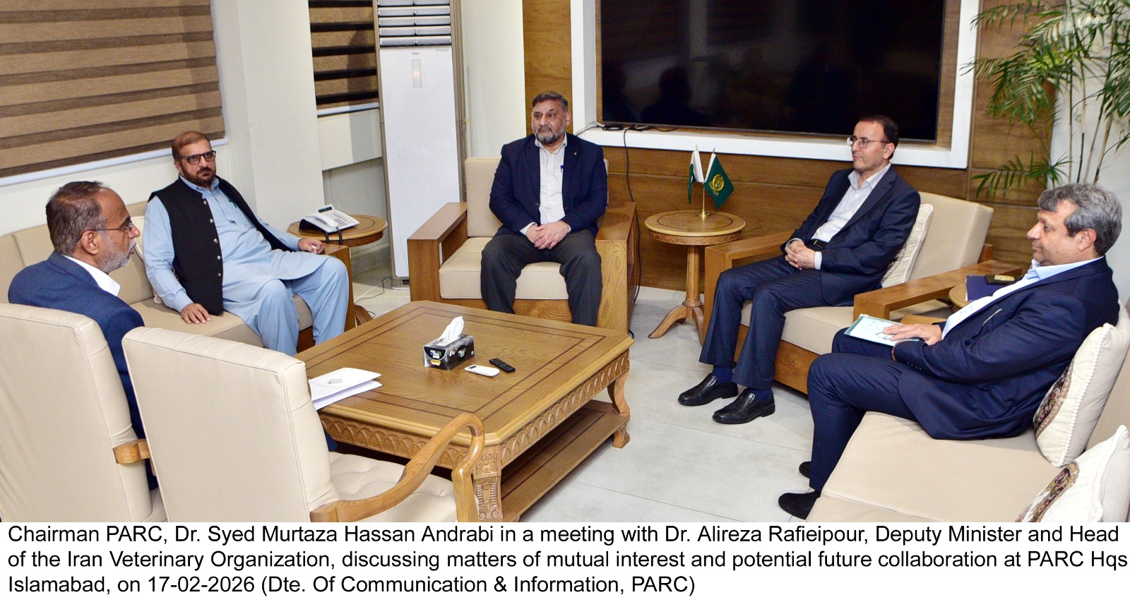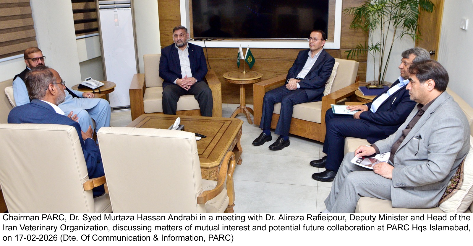 Chairman PARC, Dr. Syed Murtaza Hassan Andrabi in a meeting with Dr. Alireza Rafieipour, Deputy Minister and Head of the Iran Veterinary Organization, discussing matters of mutual interest and potential future collaboration at PARC Hqs Islamabad, on 17-02-2026