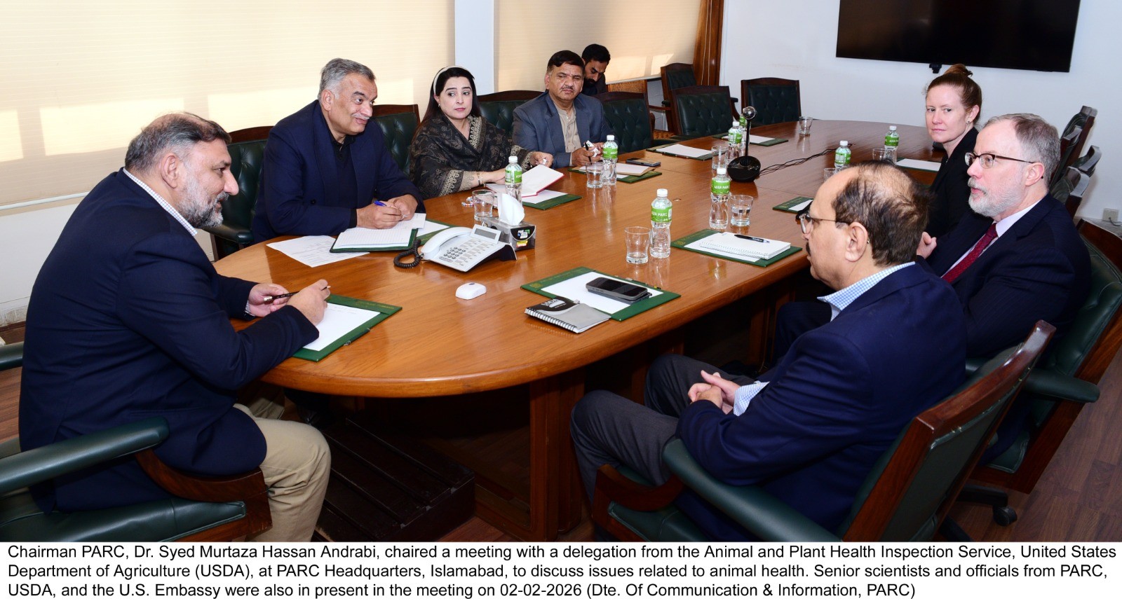 Chairman PARC, Dr. Syed Murtaza Hassan Andrabi, chaired a meeting with a delegation from the Animal and Plant Health Inspection Service, United States Department of Agriculture (USDA), at PARC Headquarters, Islamabad, to discuss issues related to animal health. Senior scientists and officials from PARC, USDA, and the U.S. Embassy were also in present in the meeting on 02-02-2026