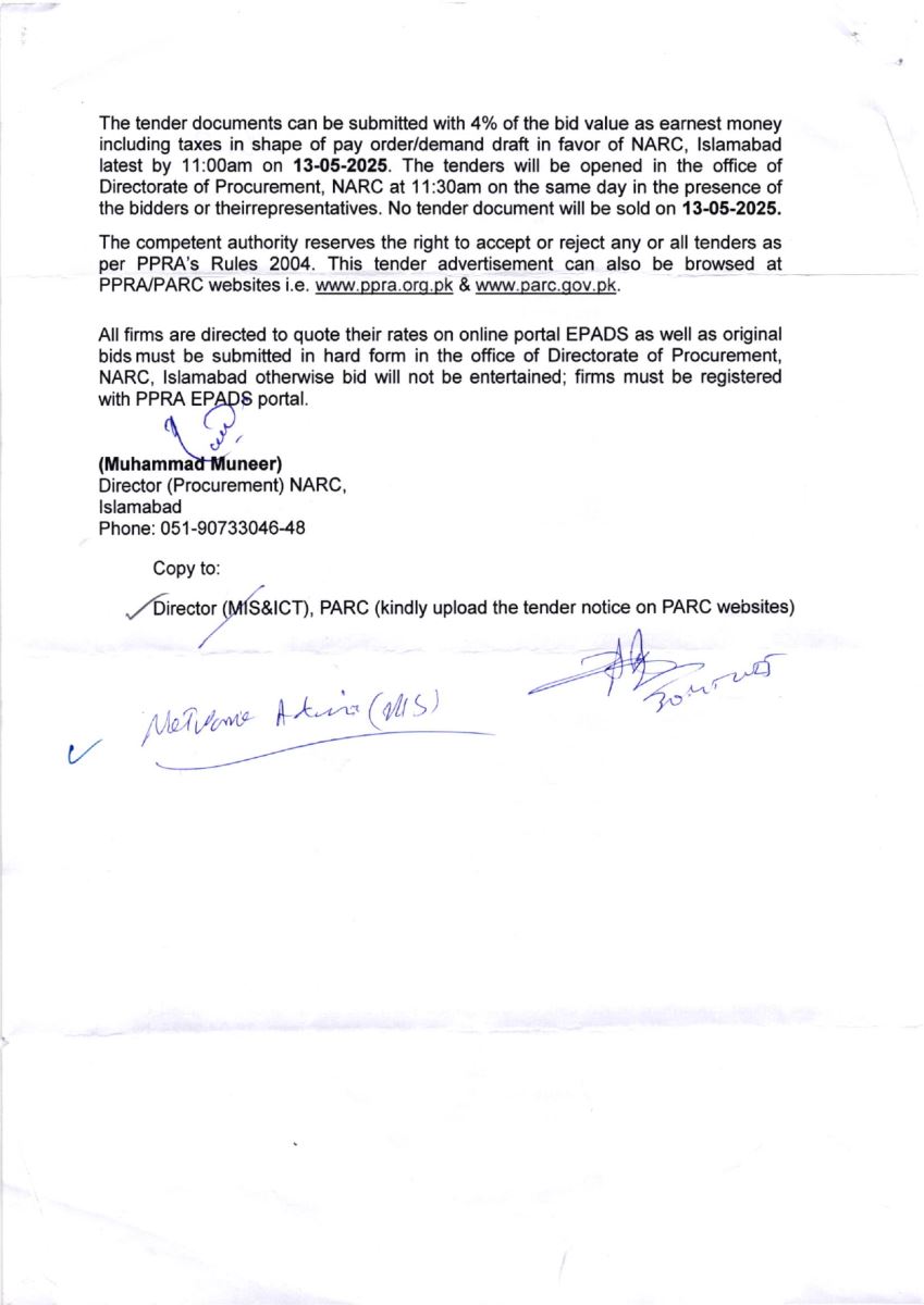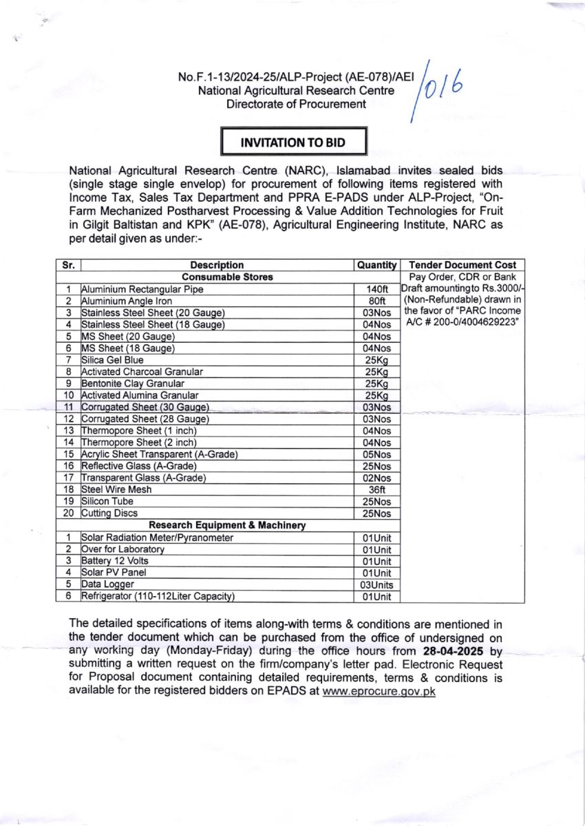 NARC INVITATION TO BID. NO.F.1-13/2024-25/ALP-Project (AE-078)/AEI
