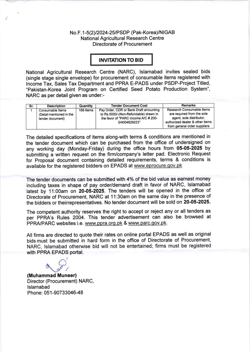 NARC INVITATION TO BID. NO.F.1-5(2)2024-25/PSDP (Pak-Korea)/NIGAB