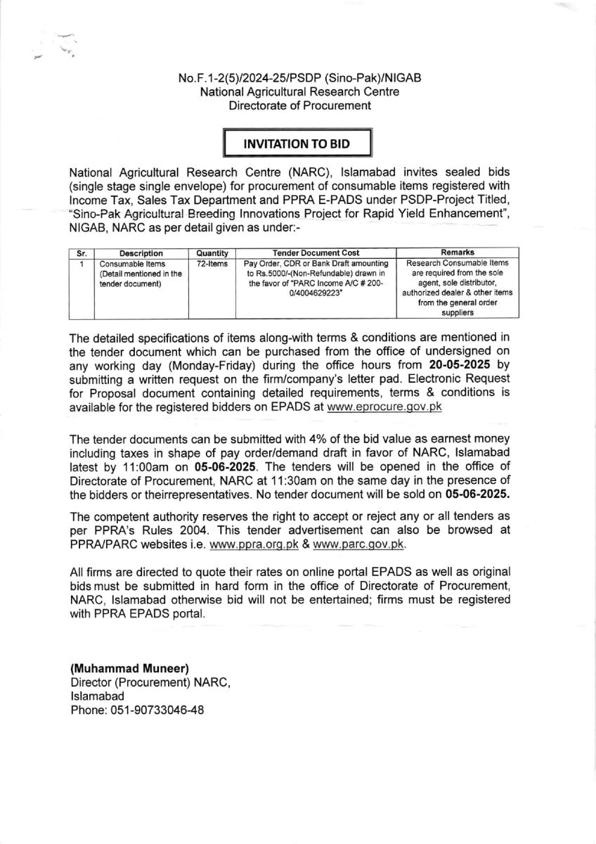 PARC INVITATION TO BID NO.F-1-2(5)/2024-25/PSDP