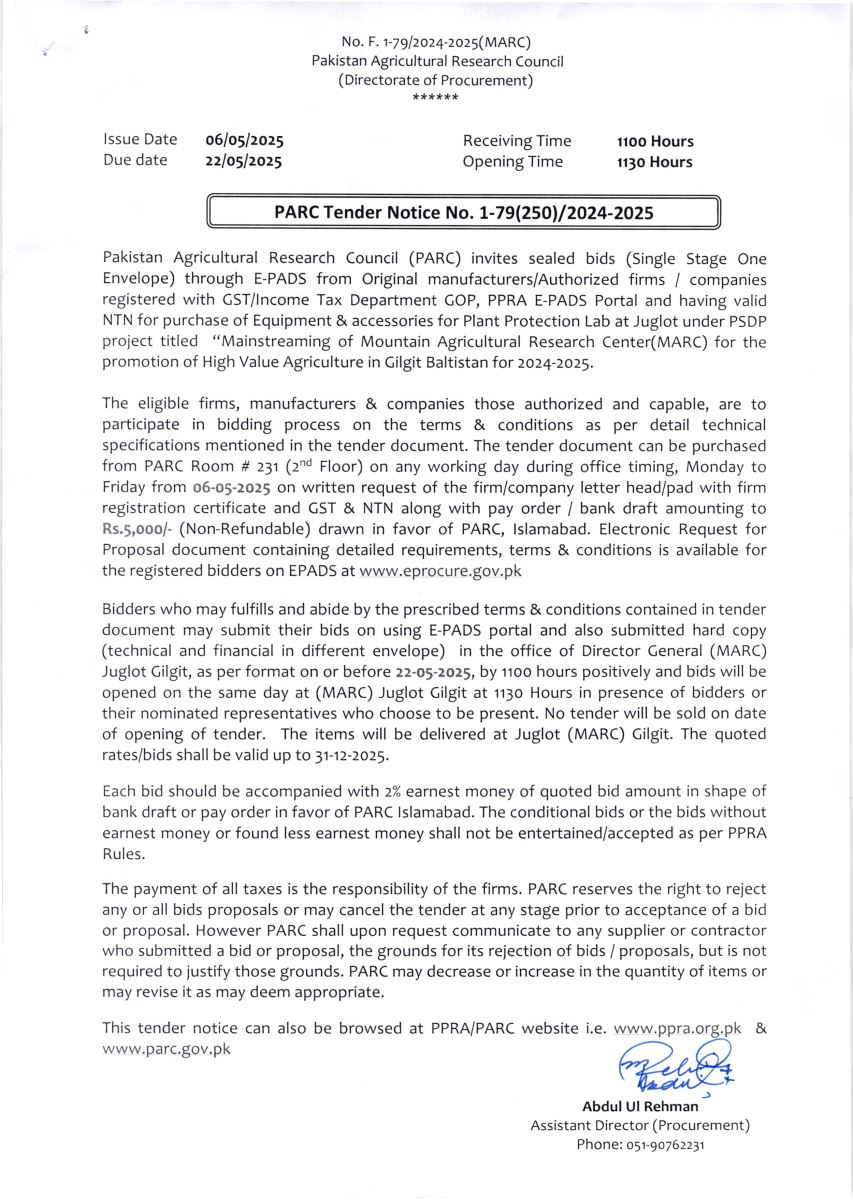 PARC Tender Notice No. 1-79(250)/2024-2025