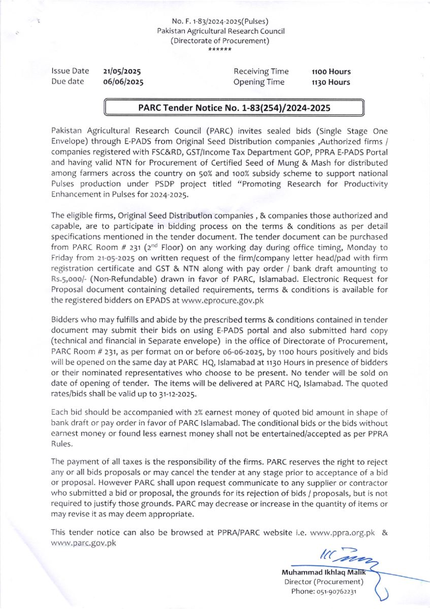 PARC INVITATION TO BID NOTICE NO.1-83 (254)/2024-2025