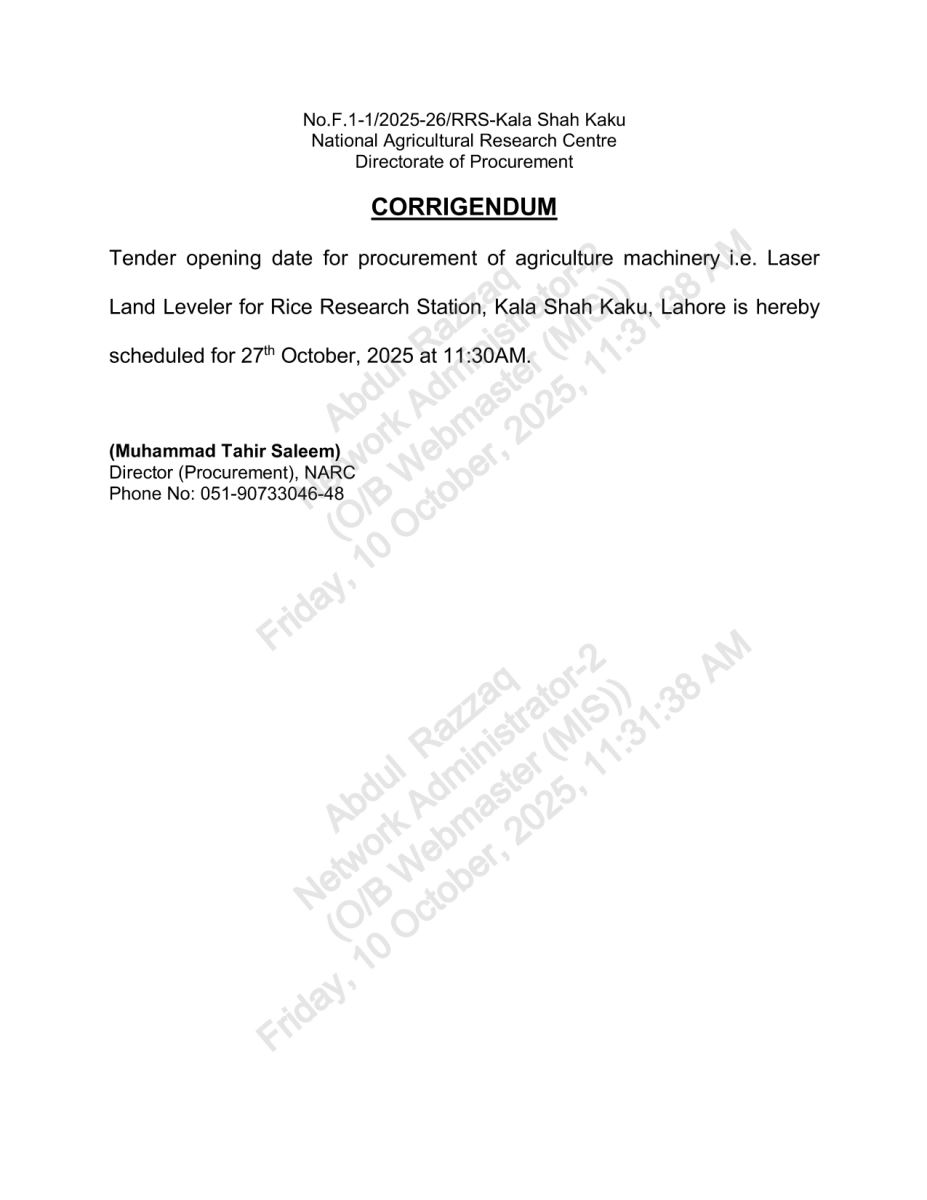 Corrigendum-Tender Notice No.F.1-1/2025-26/RRS-Kala Shah Kaku
