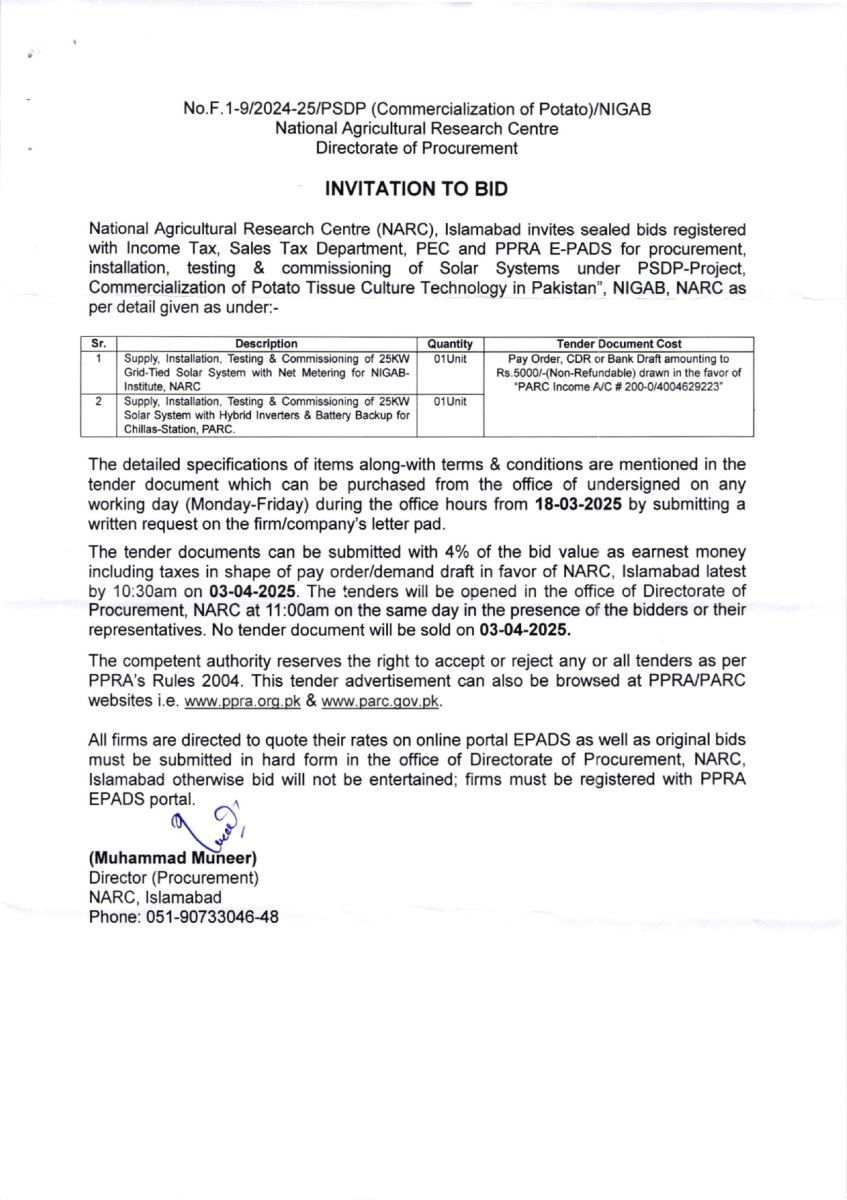 NARC INVITATION TO BID NO. F.1-9/2024-25/PSDP (Commercialization of Potato)/NIGAB