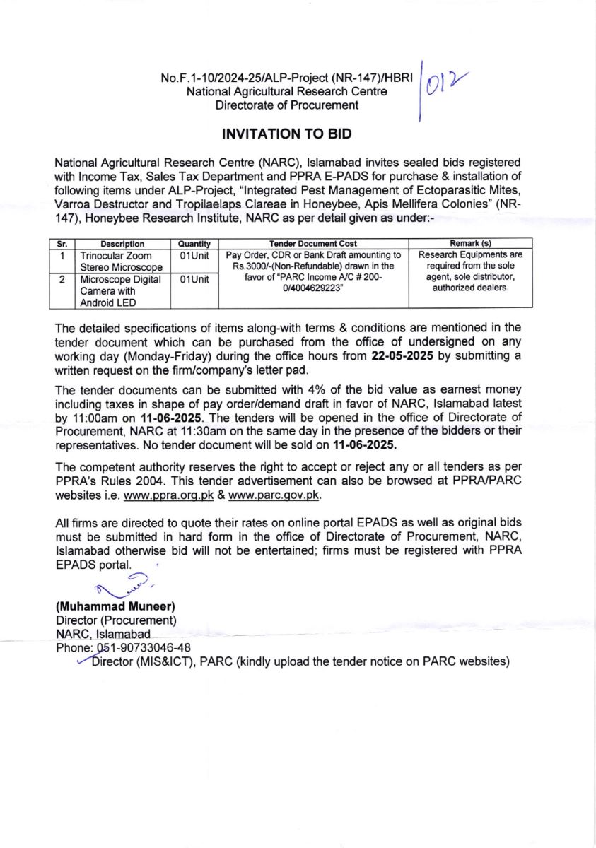 NARC INVITATION TO BID NO. F.1-10/2024-25/ALP-PROJECT(NR-147)/HBRI/012