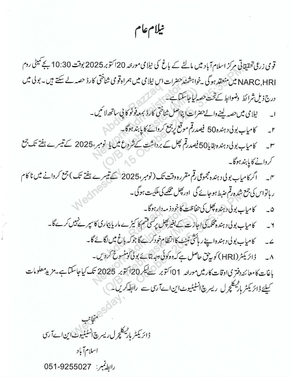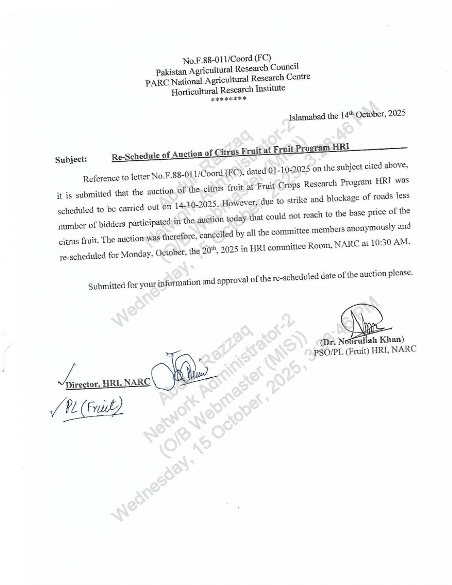 Reschedule of Auction of Citrus Fruit at Fruit Program HRI NARC)