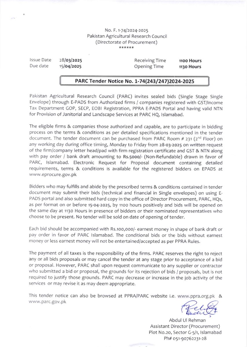PARC Tender No. 1-74/(243/247)2024-2025