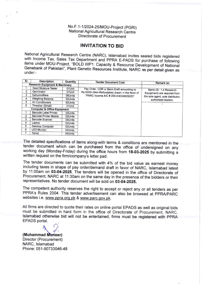 NARC INVITATION TO BID NO. F.1-1/2024-25/MOU-Project (PGRI)