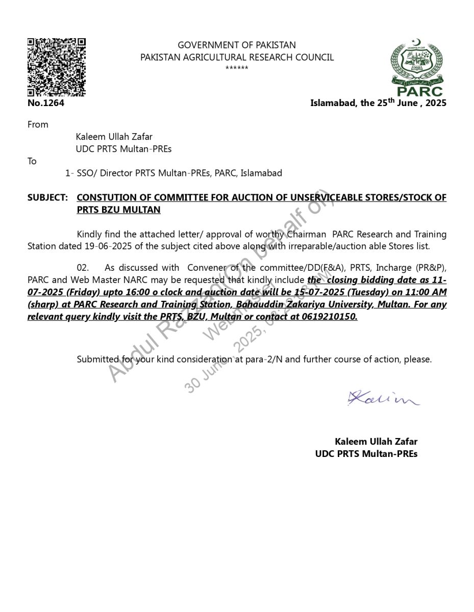 AUCTION OF UNSERVICEABLE STORES/STOCK OF PRTS BZU MULTAN