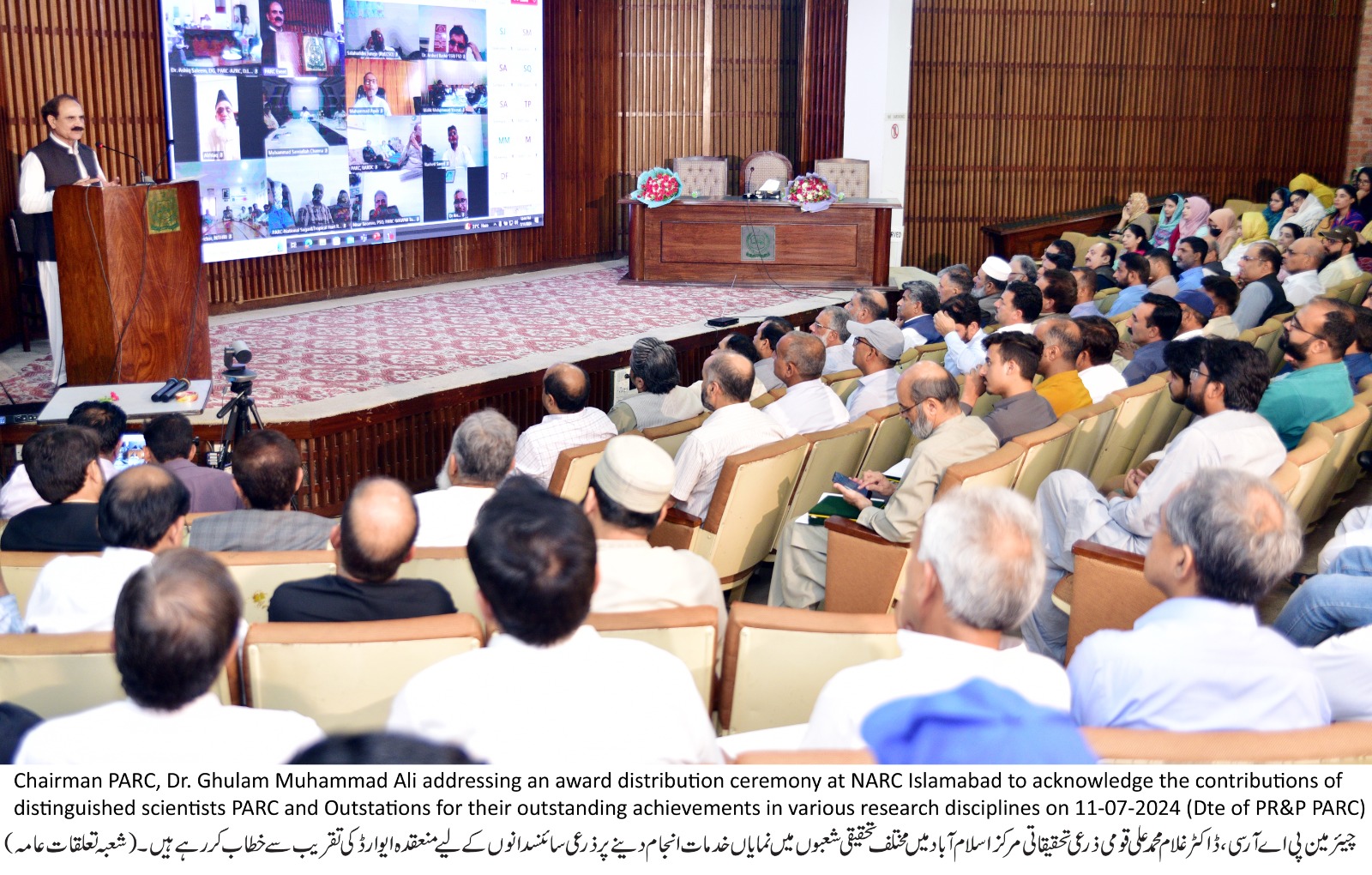 All the Scientists Must Pursue Excellence in Agricultural Research, Chairman PARC Islamabad: (PR&P, PARC) An awards ceremony was convened at the National Agricultural Research Centre (NARC) in Islamabad, to acknowledge distinguished scientists who have made significant contributions in various research domains such as Animal Sciences, Plant Genomics, Vaccine Development, Floriculture, Aquaculture, Food Security, Agricultural Trade and other related disciplines. Forty eight agricultural scientists were awarded for their meritorious services in their respective fields. Chairman, Pakistan Agricultural Research Council (PARC) graced the ceremony as the chief guest. In his address to the scientists, Chairman PARC highlighted the pivotal role of PARC in ensuring national food and nutritional security. Emphasizing the importance of diligence and dedication, he urged all scientists to persevere in their respective fields to further advance the overarching mission. Furthermore, Chairman PARC underscored the critical need for interdisciplinary collaboration and innovation in addressing contemporary agricultural challenges. He commended the awardees for their outstanding achievements and encouraged them to continue their pursuit of excellence in research and development. He further said that the council is always ready to support its scientists in every possible manner and the scientists should use this as an opportunity to develop new techniques in order to ensure national food security. The ceremony served as a platform to celebrate the collective efforts of the scientific community in driving progress and sustainability in agriculture, thereby reinforcing the commitment to enhancing food security and promoting scientific advancement in Pakistan. At the end, all the scientists presented souvenir to chairman PARC for his meritorious services in the field of agriculture and thanked Chairman PARC for solving financial and administrative issues of the council..jpeg)