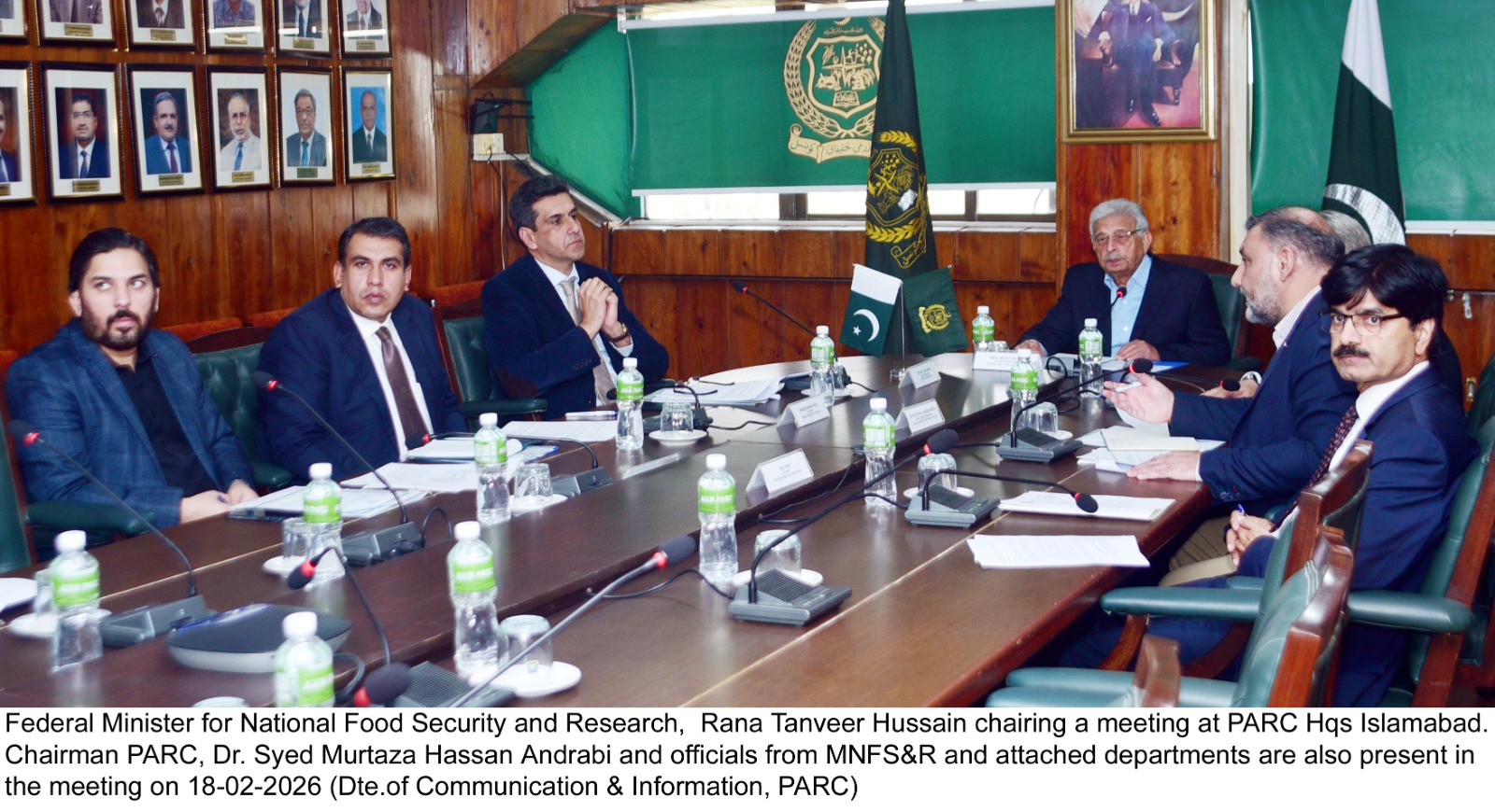 Federal Minister for National Food Security and Research, Rana Tanveer Hussain chairing a meeting at PARC Hqs Islamabad. Chairman PARC, Dr. Syed Murtaza Hassan Andrabi and officials from MNFS&R and attached departments are also present in the meeting on 18-02-2026.