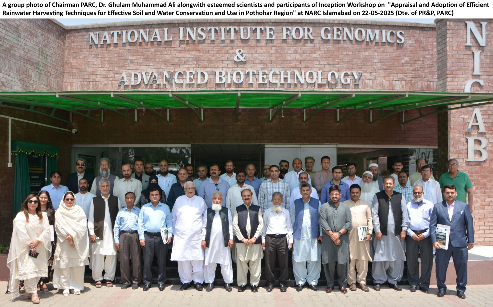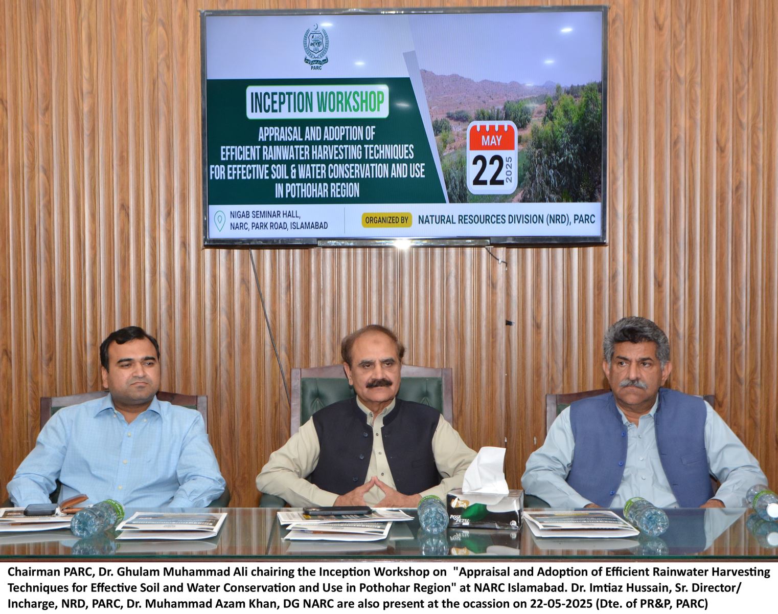 Chairman PARC, Dr. Ghulam Muhammad Ali adressing an Inception Workshop on "Appraisal and Adoption of Efficient Rainwater Harvesting Techniques for Effective Soil and Water Conservation and Use in Pothohar Region" at NARC Islamabad on 22-05-2025