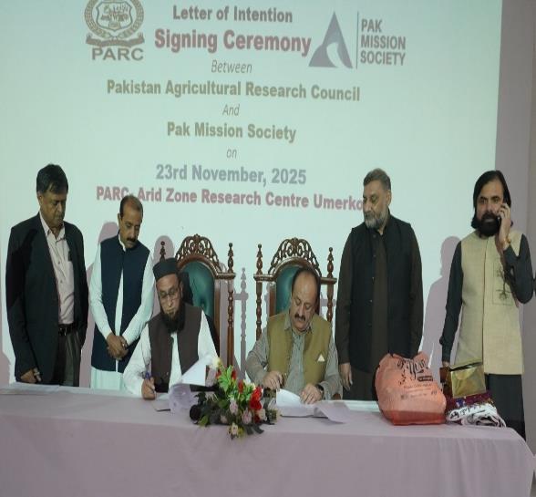 The signing ceremonies of Letters of Agreement (LoA) formalizing a multi party collaboration between Pakistan Agricultural Research Council, SG Allied Business Ltd., Pakistan Pest Management Association, Thar Foundation and Pak Mission Society held at PARC-SARC, Karachi and AZRC, Umer Kot on 21 and 23 November 2025 to support joint work on research, capacity building and industry linked technology transfer. Dr. Syed M. H. Andrabi, Chairman PARC, graced and presided over the ceremonies. Director Establishment, PARC, Directors of PARC-SARC institutes and AZRC also attended the events. Dr. Attaullah Khan, DG, PARC-SARC appreciated the efforts of the scientists and expressed hope that more researchers would come forward and actively engage in the public private partnership process. The Chairman welcomed the partnerships and outlined PARC’s key priorities in mushroom value addition, emphasizing its strong potential for income generation through low-cost cultivation and diversified products. He noted the importance of integrated pest management, where collaboration with industry can minimize crop losses and promote safer application practices. He also highlighted livestock development in Tharparkar, where joint initiatives with the Thar Foundation can help improve breeds, strengthen feeding systems and expand animal health services. PARC and Pakistan Mission Society would work together to support community-level agriculture and food security initiatives with focus on farmer training, promoting kitchen gardening, strengthening value addition, and carrying out joint field activities. He further added that these collaborations would better align research with industry needs and contribute to improve livelihoods across the Sindh region. The representatives of four organizations were of view that LoA set the foundation for coordinated activities in targeted areas with the goal of improving livelihoods, supporting innovation and ensuring that research outcomes reach farmers and industry users.